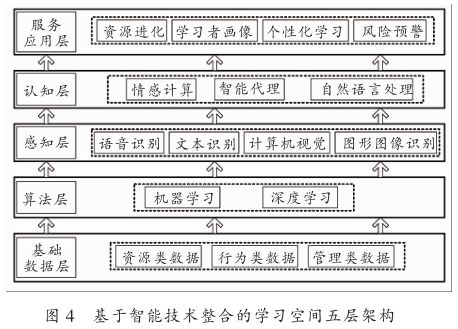 算法层主要包括机器学习和深度学习两类算法,是各类人工智能技术得以实现的关键和核心。其中,机器学习主要关注资源智能推送、学习行为建模、学习绩效预测、学习风险预警等方面;深度学习主要关注语音识别、图形图像识别、文本识别等方面,而且其准确率均能达到很高水平。