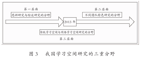 从上述系统性文献分析的结果来看,我国学习空间研究整体上呈现出三重分野(见图3)。该分野以2013年为时间节点,2013年之前呈现出思辨研究与综合研究的分野,2013年之后主要体现为团队特色研究的分野,在整体时间轴上,则体现为传统学习空间与网络学习空间的分野。