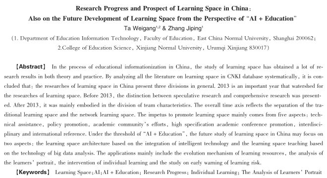 关键词:学习空间;AI;人工智能+教育;研究进展;个性化学习;学习者画像分析