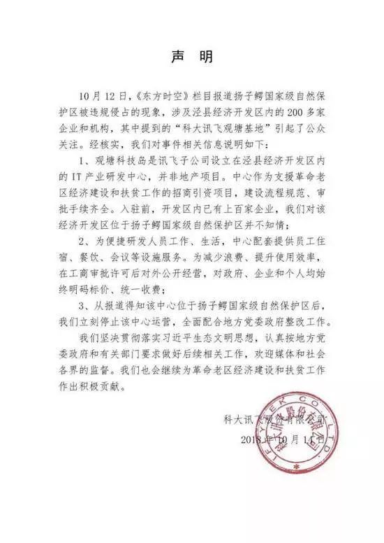 科大讯飞方面还在《声明》中称,“从报道得知该中心位于扬子鳄国家级自然保护区后,我们立刻停止该中心运营,全面配合地方党委政府整改工作。”