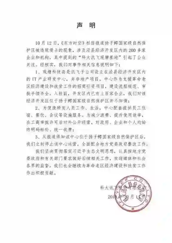 科大讯飞方面表示该项目“建设流程规范、审批手续齐全。入住前,开发区内已有上百家企业,我们对该经济开发区位于扬子鳄国家级自然保护区并不知情”。