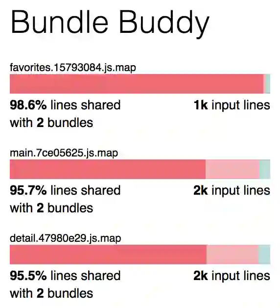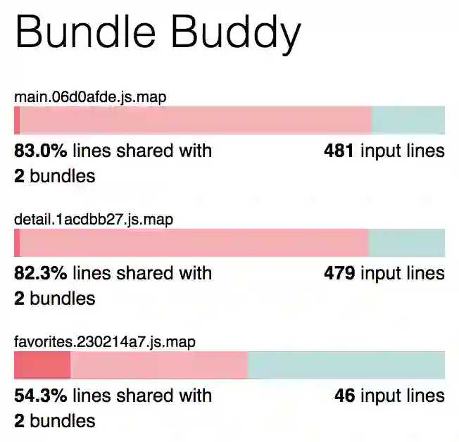 虽然我们对每个页面进行了拆分,但仍然存在一个问题:每个块中有很多重复的代码。这是因为 webpack 将每个入口点视为自己的依赖关系树,没有评估它们之间共享的代码。如果我们打开 webpack 中的源映射并使用 Bundle Buddy 或 webpack-bundle-analyzer 等工具分析我们的代码,就可以看到每个块中有多少重复代码。