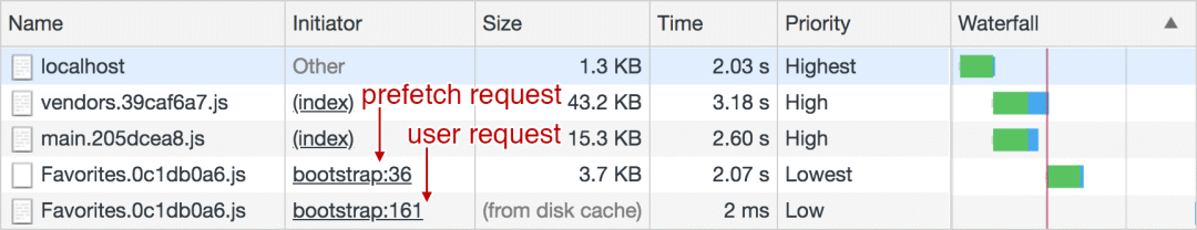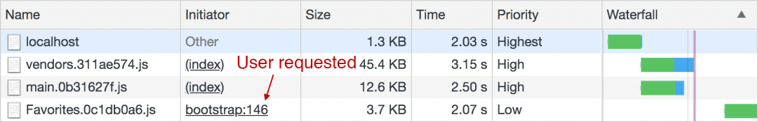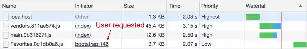 在网络连接速度较慢时,用户可能需要等待几秒钟才能收到收藏夹路由脚本。但是,因为使用了 webpackPrefetch,当用户第一次登陆应用程序时,我们可以在空闲时预取脚本,减少用户的等待时间: