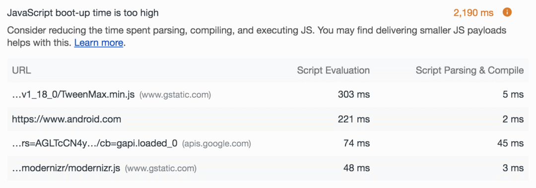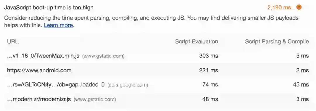 对于新手来说,Lighthouse 更容易上手。在 Chrome 中,你可以在 DevTools 的“Audits”面板中打开 Lighthouse。你需要关注一个与关于 JavaScript 性能有关的审计,就是“JavaScript Bootup Time is Too Hight”,这个审计会标记出显著影响应用程序 TTI 的 JavaScript:
