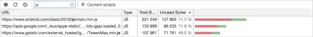 你可以利用这个审计收集的信息和 DevTools 的代码覆盖工具(你可以在 DevTools 中通过 esc 键打开它)一起找出哪些脚本包含当前路由未使用的代码。