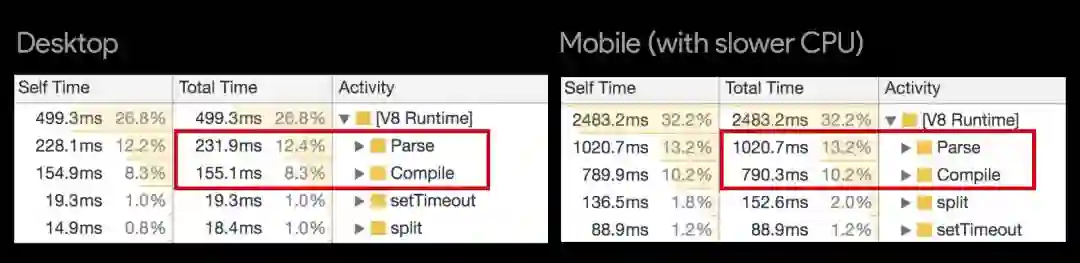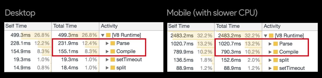 这种一刀切的方法效率低下。每一秒用在加载、解析和执行未使用代码上的时间都会延长应用程序的 TTI,对用户体验造成影响。在移动设备上,因为处理器较慢或者网络连接延迟比较严重,用户就更能感觉到这一点。下图显示了移动设备与配备了强大的处理器的台式机或笔记本电脑在解析和编译脚本方面所花费的时间对比: