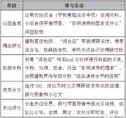 在学习《影响消费的因素》时,笔者组织学生开展“互联网+”支持下的“我的消费谁做主”项目学习,该项目通过“议题生成—调查研究—数据分析—成果分享—总结评价”五个阶段实施,具体实施见表