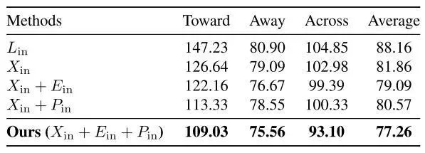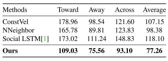 测评方式方面,本文采用了与[6]中相似的方式,使用 Final Displacement Error (FDE) 作为测评指标。FDE指标即最终预测轨迹和最终实际轨迹之间的L2距离。为了更加精细的评估,该数据集还把行人轨迹分为了1) toward 2) away 3)across三个子集,分别计算了 FDE 以及 3 个子集的平均 FDE。