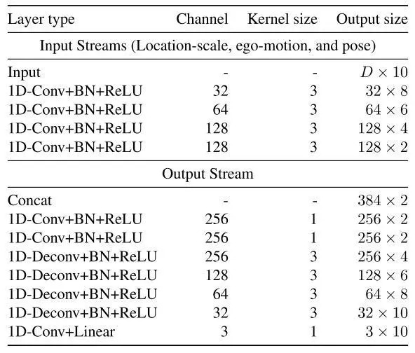 网络的具体配置如下表所示,基本上就是 1D-Conv+BN+ReLU 的堆叠。最终的输出即为所需要的未来检测框位置序列。