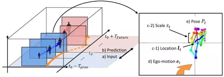 这篇文章所提出的 Future Person Localization 问题具体而言,就是已知t时刻及之前几帧图像中行人的相关信息,要求算法预测未来几帧中该行人会出现在图像中的什么位置。问题示意图如下图所示。关于这个任务的技术有很多的用途,比如帮助行人避开迎面走来的行人,或是帮助移动机器人来规划运动的路径。