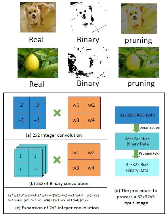 下图中(a,b,c)以2Bit的数据为例再次展示了上述分解过程。输入数据假设为CIFAR10,分辨率是(32,32,3),那么经过分解之后就会变成(32,32,256,3),这个时候我们会发现输入数据巨大无比,第一层计算量指数级增加,于是作者将原图像8bit数据的高位截掉,在分解向量中的体现就是直接去掉右侧的正负1的数,如下图所示,我们可以发现pruning之后的图像其实仍然保留了大多数的信息,且可以大大降低计算量,整个过程如下图(d)所示。