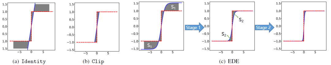 而EDE则是利用k×tanh(t×x)在不同训练阶段渐进近似sign函数,并用其梯度来代替sign函数的梯度进行反向传播,从而使得整个训练过程可以更加的平滑,从而减少信息损失。