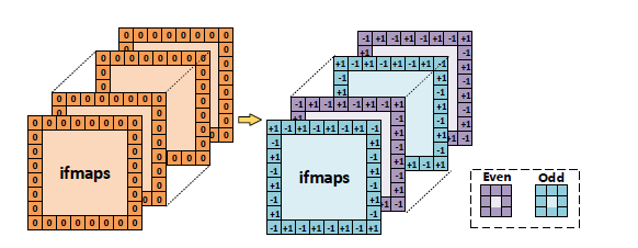 在实值卷积神经网络中,我们通常在输入四周padding的0,但是在BNN当中并没有0这种数的存在,所以大家大多数选择全-1或者全+1。有研究者发现这种padding策略对结果是有影响的,毕竟使得整个输入数据朝着1或者-1发生了偏移,上述的ReActNet也说过activations的发生偏移对结果影响还是很明显的,所以有人提出了Odd-Even padding的方式,即奇偶填充,1和-1间隔填充,如下图所示,并且发现这种填充方式可以达到填充0的效果。
