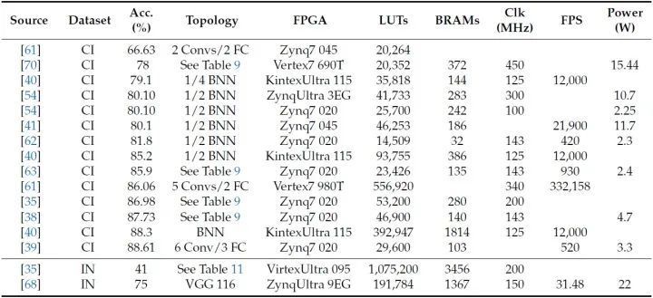 相比于传统的CPU,FPGA在硬件架构设计方面很灵活,可以支持bitswise的高效运算,而且功耗很低,其对应的终极版的专用集成电路ASIC更是如此,可以比FPGA运算更高效,更节能。目前用FPGA设计AI加速器基本都是以Xilinx的器件和开发工具为主,而他们也为二值化神经网络专门设计了一款架构FINN,开发者可以利用高层次综合工具(HLS),用C语言进行开发,直接将二值化模型部署到FPGA上,下图是一些对比结果。而Intel的Accelerator Architecture Lab也为BNN设计了一款layer accelerator的ASIC,不过并没有找到很多的相关数据,就不赘述。