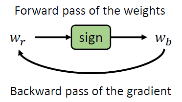 并且针对sign函数在0处不可导,其他地方导数为0无法有效进行梯度传递的问题,设计了直通估计器STE (straight through estimator),即当梯度传递遇到sign函数时,直接跳过这个函数,或者说默认sign函数输出对输入的梯度为1,即: