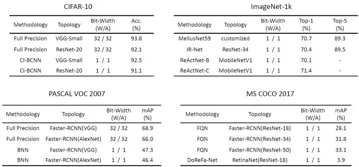 由于BNN的模型实在是太多,而每一篇论文的实验结果也非常丰富,故我从两篇综述中截取出CIFAR10,ImageNet,PASCAL VOC2007和MS COCO2017最好的一些结果,如下所示:(注意:其中MS COCO2017的结果我似乎没有在论文原文中找到依据,所以大家就图个乐,不要较真)