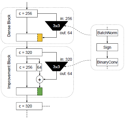 话题转回来,MeliusNet根据用shotcut和concat增强Quality和Capacity的指导思想设计了两个二值友好的模块,如下图所示,一个是Dense Block,另一个是Improvement Block,这两个模块在网络中每次都是交错出现,在整个信息流中不断地增强二值化feature map的信息表达,从而提升精度。这篇论文除了这个核心思想之外,还提出了一个我觉得比较有意思的思路,那就是二值化网络应该有一套自己的网络结构,这种二值化友好结构的效果要优于相似FLOPs下全精度模型二值化后的结构,并且做了相应的实验进行验证,通俗地来讲就是倡导大家要走二值化特色社会主义道路。
