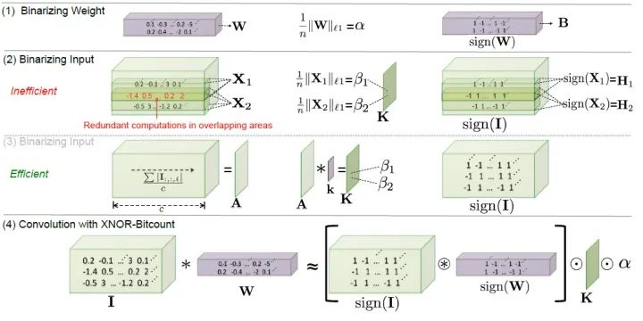 在第一篇BNN发表不久,XNOR-Net横空出世,这篇论文其实提出了两个模型,一个是BWN(Binary Weight Networks),另一个才是XNOR-Net,BWN只使用了二值化的weights,而activation仍然采取的float32全精度,按照BNN的定义其实BWN不能算在二值化网络的范畴,但它的效果那是杠杠的,跟全精度相差不大,看来神经网络对weights的二值化还挺不敏感的。而该文的主角XNOR-Net是正儿八经不掺水的二值化神经网络,weights和activations都采取的二值化。它主要是在原始BNN基础上考虑了量化误差,并且提出了对实值weights每个输出通道方向上提取出一个scaling factor,用于恢复二值化weights的信息,同时对activation在HW方向上每个pixel上提取一个scaling factor,用于恢复二值化activations的信息,这两种scaling factor都无需学习,直接计算相应的L-1范数就能得到,且不影响二值化高效的卷积计算过程。最后的实验也比原始的BNN要好不少,并且首次展示了BNN在ImageNet这种大型数据集上的实验结果,还声称在卷积计算上可以达到58倍的加速效果,节省32倍的内存。