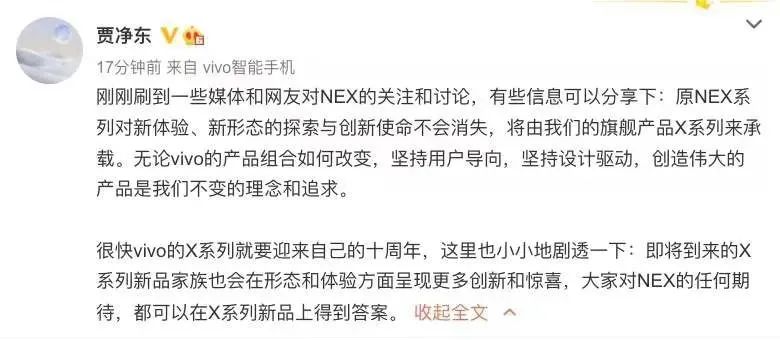 vivo 在近期的组织调整中撤销了NEX事业部。NEX是vivo 在2018年推出的高端手机品牌,首款产品起售价近4000 元,后逐步提升至5000 元及更高。vivo 品牌副总裁贾净东表示,NEX的使命将由X系列承载。(财经网)