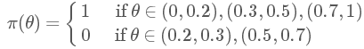 现在可以说明,我们把主观揣测的先验概率定为均匀分布是合理的,因为我们在对一件事物没有了解的时候,先认为每种可能性都一样是非常说得通的。有人会认为,既然无信息先验是说得通的,而且贝叶斯公式会根据我们的观测值不断更新后验概率,那是不是我们随便给一个先验概率都可以呢?当然……不行!!这个先验概率是不能瞎猜的,是需要根据一些前人的经验和常识来判断的。比如我随便猜先验为一个分段函数: