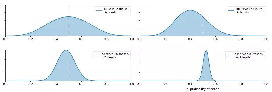 有的人会说,这还不是在大量数据下得到了正面概率为 0.5 嘛,有什么好稀奇的?注意了!画重点了!(敲黑板) 记住,不要和一个统计学家或者数学家打赌!跑题了,跑题了。。。说回来,我们上面就说到了古典概率学的弊端就是如果掷了 2 次都是正面,那我们就会认为正面的概率是 1,而在贝叶斯统计学中,如果我们掷了 2 次都是正面,只能说明正面是1的可能性最大,但还是有可能为 0.5, 0.6, 0.7 等等的,这就是对古典统计学的一种完善和补充,于是我们也就是解释了,我们所谓的地震的概率为 5%;生病的概率为 10% 等等这些概率的意义了,这就是贝叶斯统计学的哲学思想。