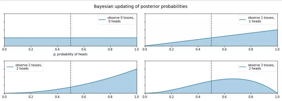 从图中我们可以看出,0 次试验的时候就是我们的先验假设——均匀分布,然后掷了第一次是正面,于是概率分布倾向于 1,第二次又是正,概率是 1的可能性更大了,但注意:这时候在 0.5 的概率还是有的,只不过概率很小,在 0.2 的概率变得更小。第三次是反面,于是概率分布被修正了一下,从为1的概率最大变成了 2/3 左右最大(3次试验,2 次正 1 次反当然概率是2/3的概率最大)。再下面就是进行更多次的试验,后验概率不断根据观测值在改变,当次数很大的时候,结果趋向于 0.5 (哈哈,结果这还是一枚普通的硬币,不过这个事件告诉我们,直觉是不可靠的,一定亲自实验才行~)。