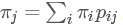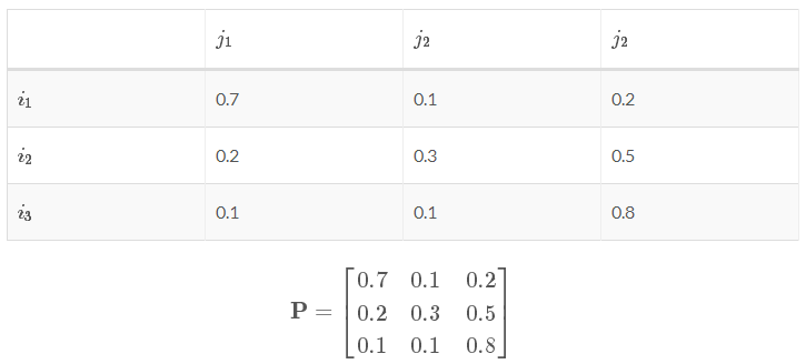 可以看出状态 i 中的一个观测值转移到下个状态 j 的分别三个观测值的概率和为1。