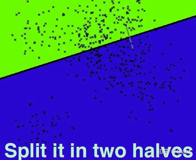 annoy的每一次空间划分,可以看作聚类数为2的KMeans过程。收敛后在产生的两个聚类中心连线之间建立一条垂线(图中的黑线),把数据空间划分为两部分。