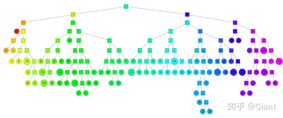 最终生成的二叉树具有如下类似结构,二叉树底层是叶子节点记录原始数据节点,其他中间节点记录的是分割超平面的信息。