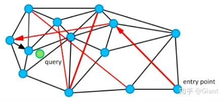 朴素查找法:不少人脑子里都冒出过这样的朴素想法,把某些点和点之间连上线,构成一个查找图,存储备用;当我想查找与粉色点最近的一点时,我从任意一个黑色点出发,计算它和粉色点的距离,与这个任意黑色点有连接关系的点我们称之为“友点”(直译),然后我要计算这个黑色点的所有“友点”与粉色点的距离,从所有“友点”中选出与粉色点最近的一个点,把这个点作为下一个进入点,继续按照上面的步骤查找下去。如果当前黑色点对粉色点的距离比所有“友点”都近,终止查找,这个黑色点就是我们要找的离粉色点最近的点。