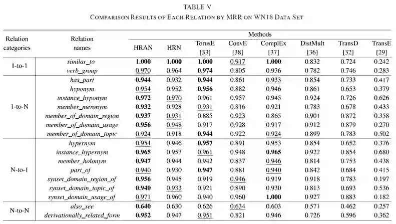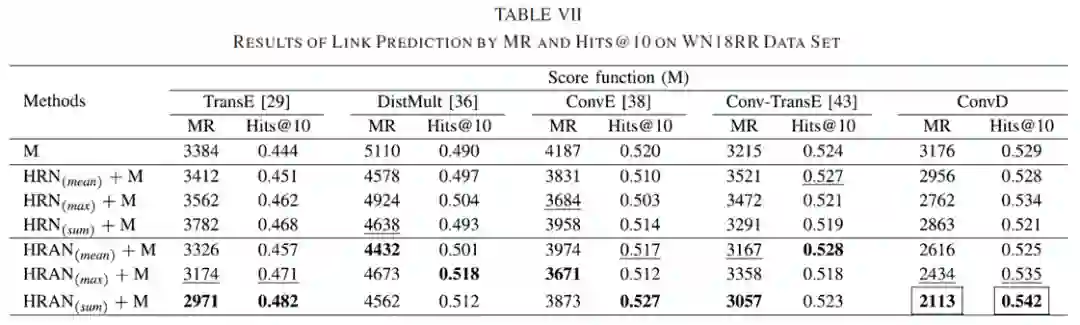 上述结果表明,所提出的HRAN能够对实体和关系生成表达性嵌入,并用于连接预测任务。通过引入关系路径的注意力机制,可以提高方法的有效性。