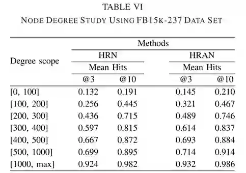 在KGs中,节点的度是指每个实体在所有关系路径下的邻居实体。实体的级别越高,表示包含的邻居实体越多。计算Hits@3和Hits@10的均值结果如下表所示。