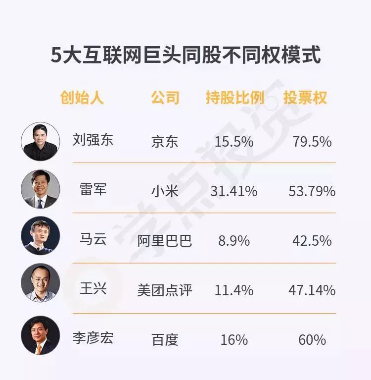 所以,曾有人说京东是刘强东一个人的王国。同时马云、李彦宏、雷军、王兴等都掌握着各自公司的绝对投票权,即控制权。