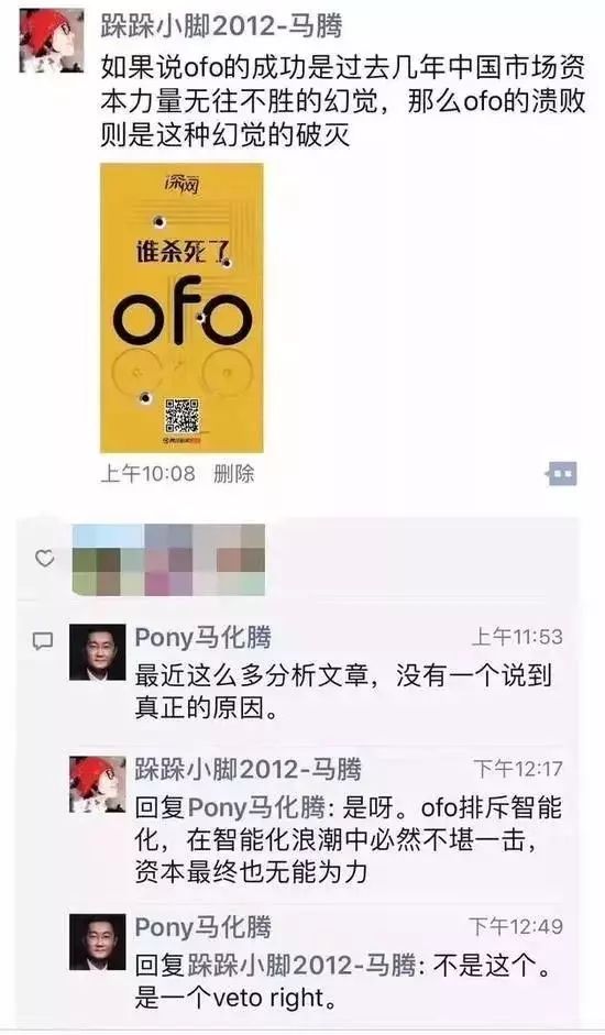 ofo走到今天这个地步,任专家媒体如何剖析解读,最管用的仍然是马化腾的一句话——一个veto right(否决权)。