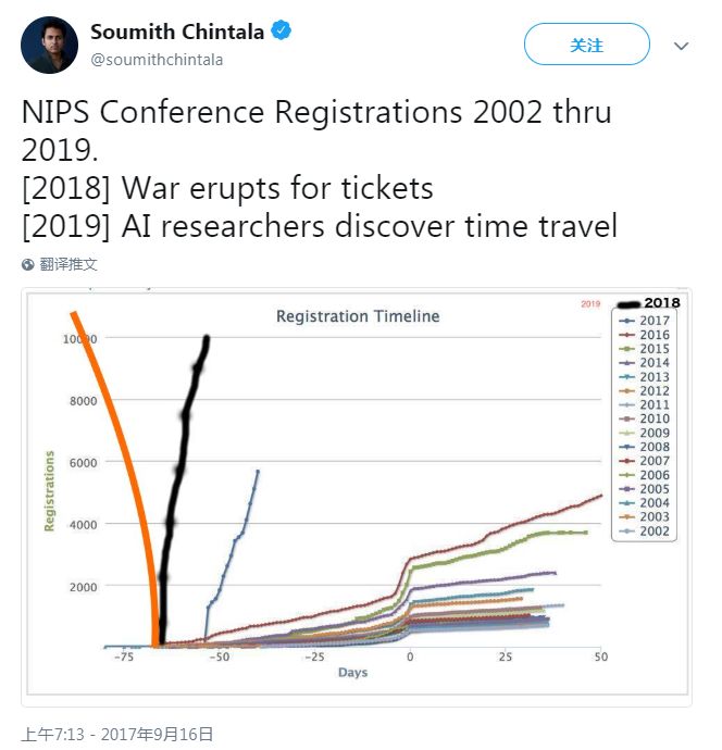 (1) - 没想到从能去 NIPS 2018 到去不了了,可以只差喝一杯咖啡的时间。显然大会门票在 15 分钟之内就卖完了。去年我还笑话过下面这张图,没想到今天就成真了。