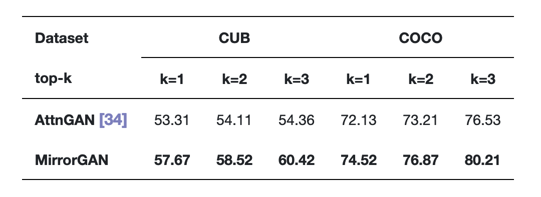 表2 在CUB和COCO数据集上,MirrorGAN和AttnGAN的R精度得分。