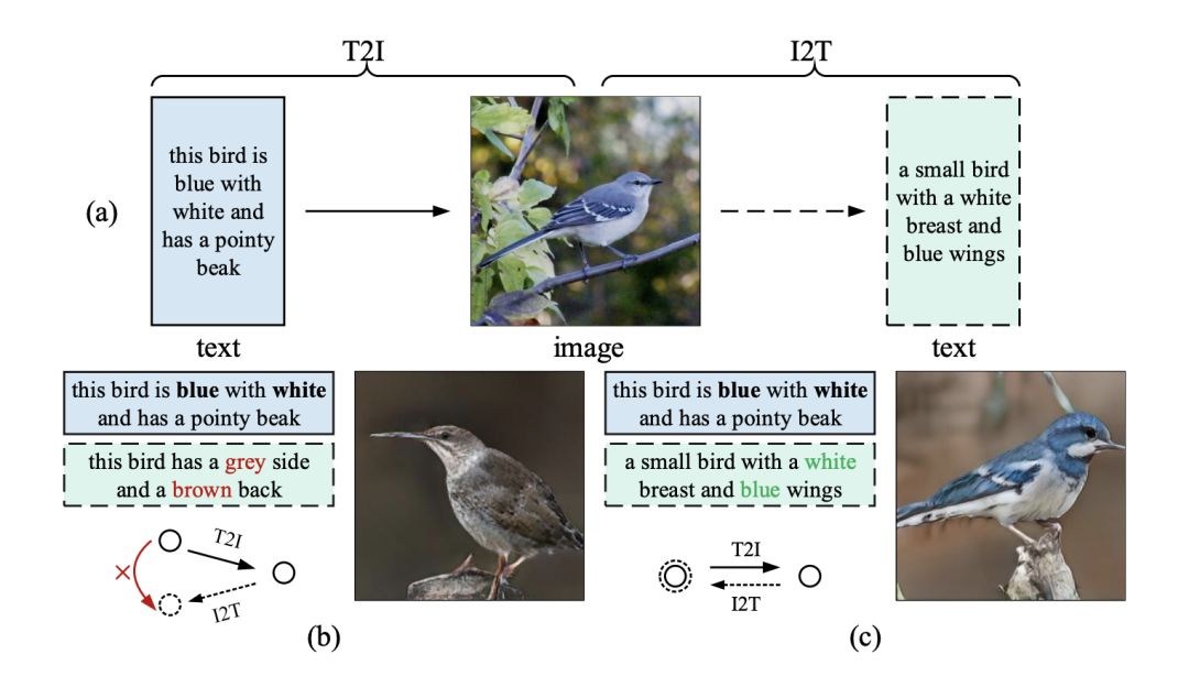 如图1 (a)和(c)所示,如果T2I生成的图像在语义上与给定的文本描述一致,则I2T对其重新描述应该与给定的文本描述具有完全相同的语义。换句话说,生成的图像应该像一面镜子,准确地反映底层文本语义。
