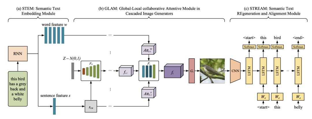 STEM生成单词级和句子级的嵌入;GLAM有一个级联的架构,用于从粗尺度到细尺度生成目标图像,利用局部词注意和全局句子注意,逐步增强生成图像的多样性和语义一致性;STREAM试图从生成的图像中重新生成文本描述,该图像在语义上与给定的文本描述保持一致。