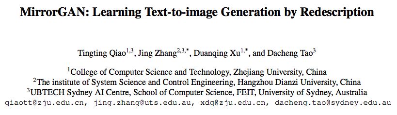 最近,来自浙江大学、悉尼大学等高校的研究人员,提出一种新颖的全局-局部注意和语义保持的文本-图像-文本(text-to-image-to-text)框架来解决这个问题,这种框架称为MirrorGAN。