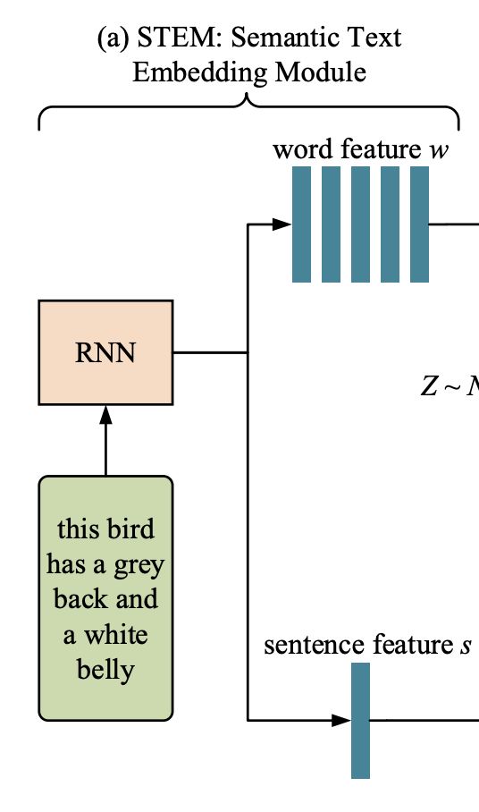 如图2最左边所示(即上图),使用一个递归神经网络(RNN)从给定的文本描述中提取语义嵌入T,包括一个嵌入w的单词和一个嵌入s的句子。
