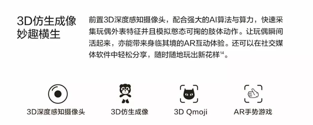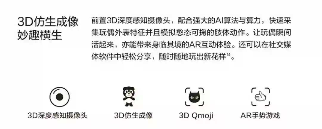 这一代Mate 20 Pro除了搭载全新一代徕卡三摄外,还提供了前置2400万像素3D深度感知摄像头,并配合强大的AI算法与算力,首次实现了3D仿生成像、3D Qmoji表情以及AR手势游戏。