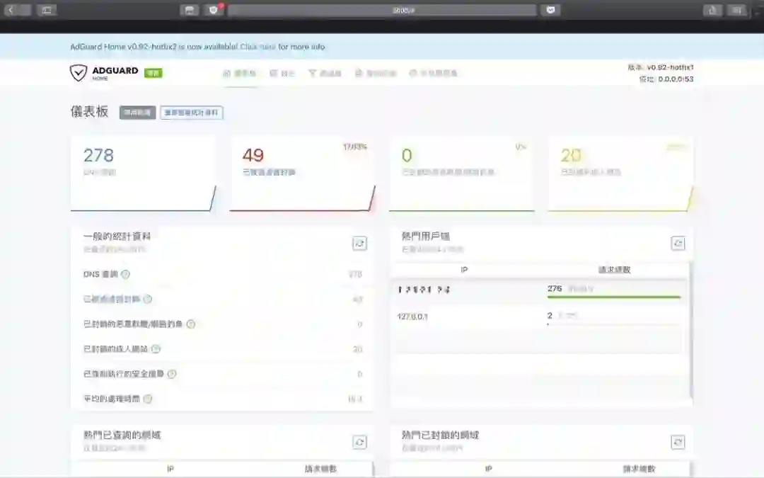 在「仪表板」上,我们可以看到 DNS 查询次数、被过滤器封锁的网站、查询 DNS 请求的 IP 地址等等信息。