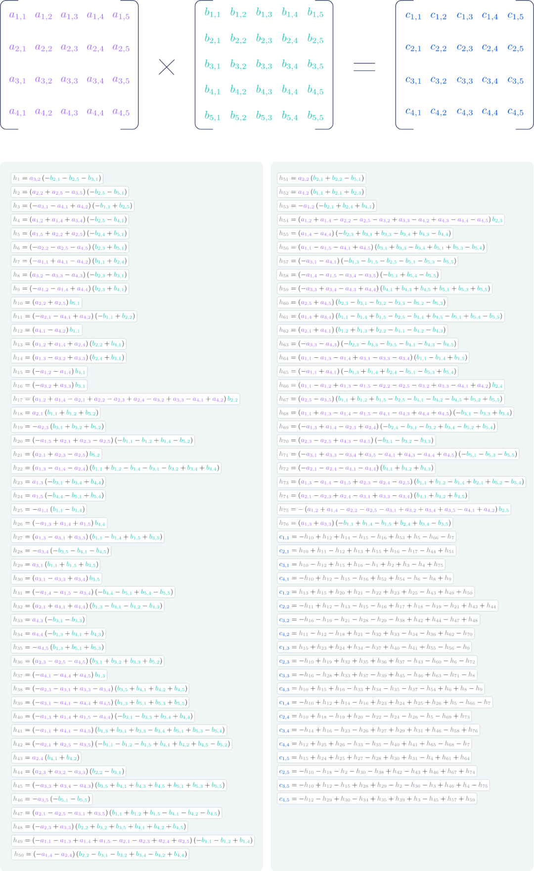 通过研究非常小的矩阵(大小为 2x2),Strassen 发现了一种巧妙的方法来组合矩阵的项以产生更快的算法。之后数十年,研究者都在研究更大的矩阵,甚至找到 3x3 矩阵相乘的高效方法,都还没有解决。