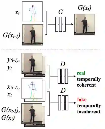 我们将这个问题视为一个具有时空平滑的每帧 image-to-image 转换问题。利用姿势检测作为原和目标之间的中间表示,我们学习了从姿势图像到目标对象外观的映射。