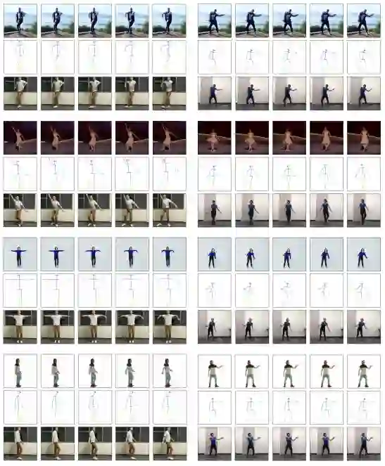 于是,他们观察了基于人体姿态关键点(keypoint),关键点本质上是编码身体的位置而不是外观,可以作为任何两个主体之间的中间表示。而姿势可以随着时间的推移保持动作特征,同时尽可能地抽象出对象身份标识。因此,我们将中间的表示设计为火柴人自试图,如下图所示。