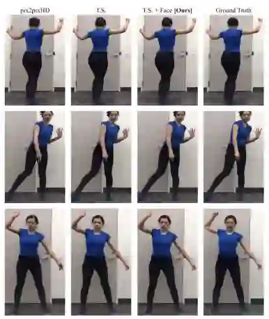 因此,的模型经过训练,可以生成特定目标对象的个性化视频。然后,将动作从源迁移到目标,将姿势火柴人图形输入到训练模型中,得到与源姿势相同的目标对象的图像。