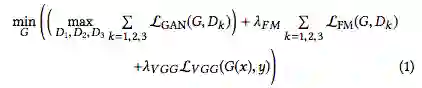 方法是基于 pix2pixHD 中的目标提出来的。在初始条件 GAN 设置中,生成器网络 G 对多尺度鉴别器 D = (D1,D2,D3) 进行极大极小博弈。