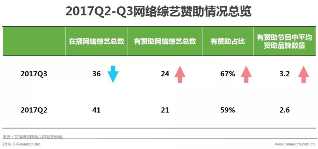 根据艾瑞咨询的监测,Q3一共有36部在播纯网综艺,其中24部网综有品牌赞助,约占67%,每个节目平均赞助品牌的数量为3.2个。