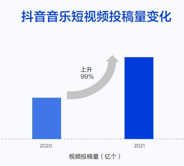 以抖音为例,其不久前发布的2021年短视频音乐大数据报告显示,平台全年音乐创作视频的投稿量累计超184亿个,同比增加99%,音乐短视频日均创作量逾5000万个。