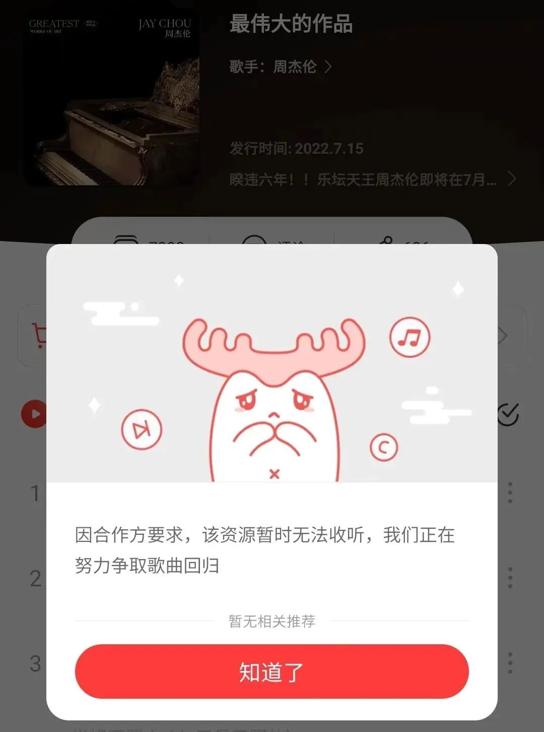 7月8日,QQ音乐开售新专数字版本才算扳回一城,目前已售出272万张。而网易云这边,因为过往恩怨无缘周杰伦,整张专辑全是灰色。